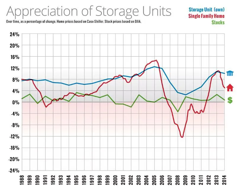 Storage units have consistently shown strong appreciation and resilience, outperforming both single-family homes and stocks over the past three decades. Their steady upward trend, contrasted with the volatility of housing and the relative stagnation of stocks, highlights storage units as a reliable and high-performing investment. This combination of dependable growth and stability makes them a smart choice for investors seeking both income and long-term capital gains.